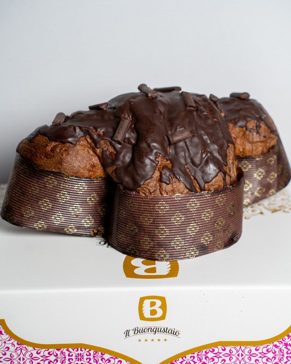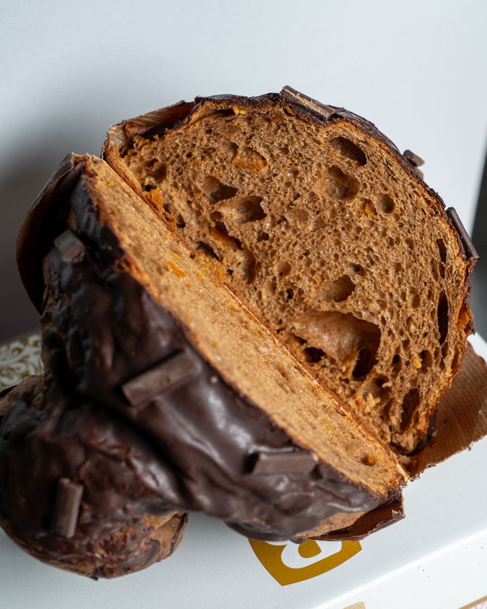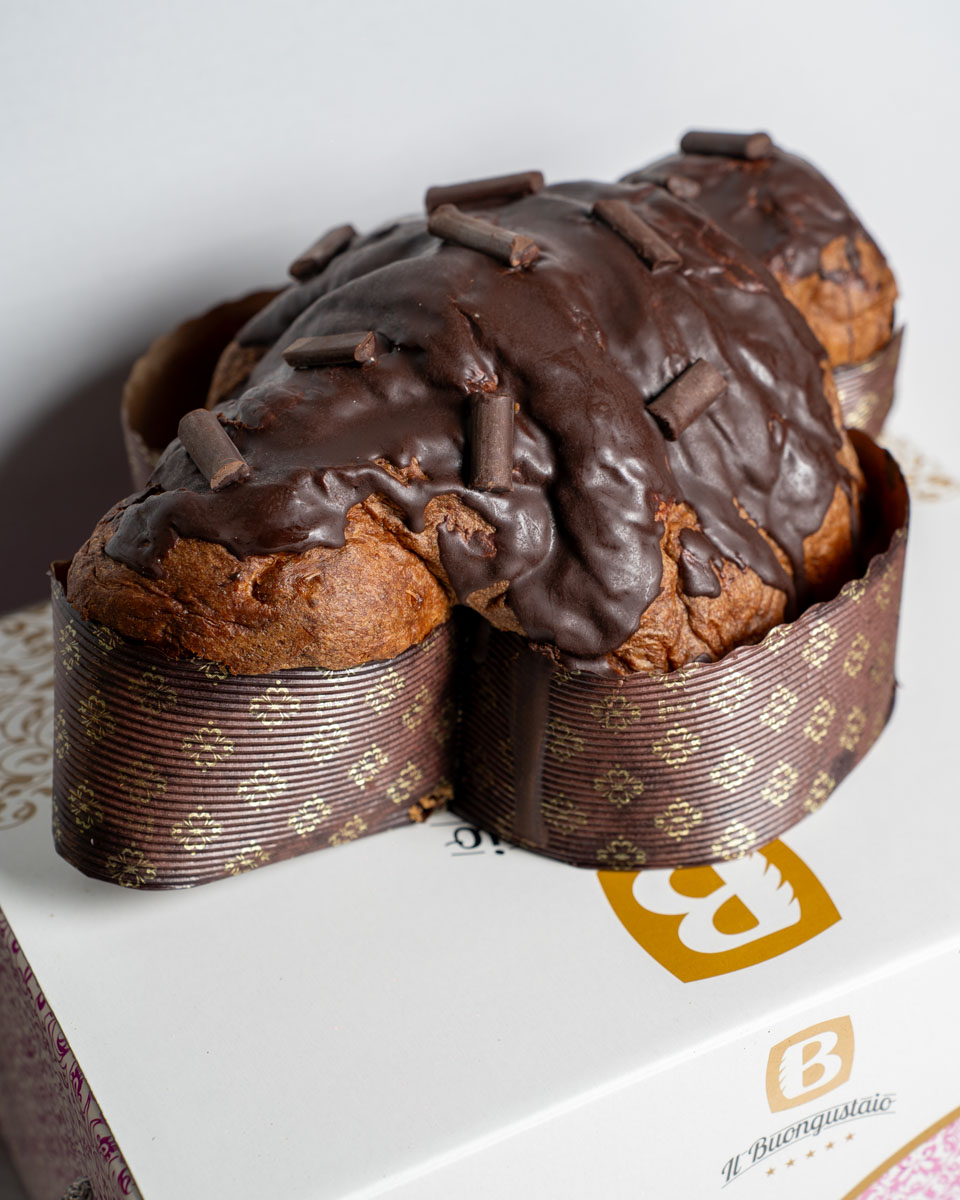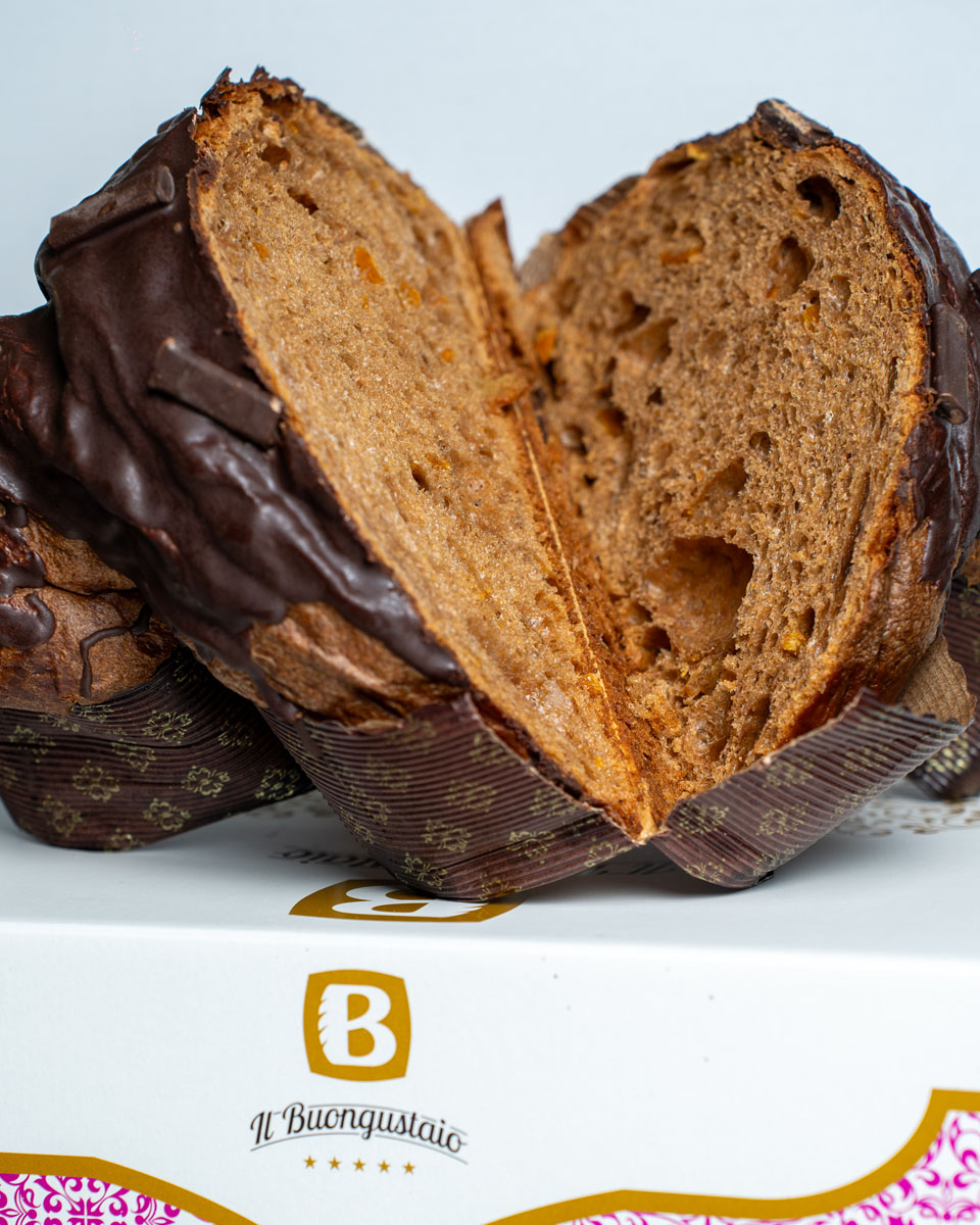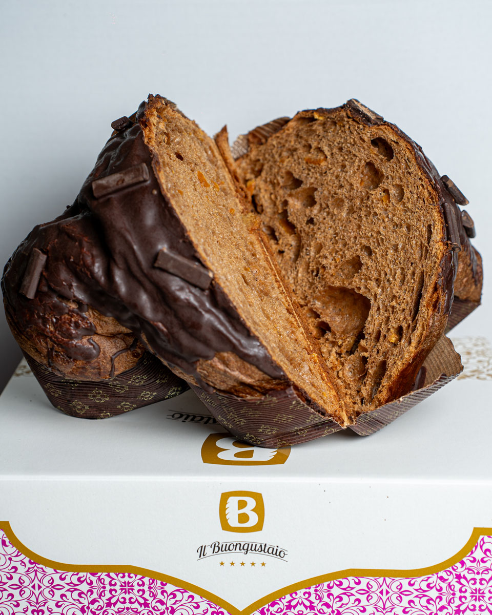 Impasto: Farina di grano tenero (da coltivazione propria), lievito madre (frumento), burro, tuorli d’uovo, zucchero, canditi di arancia (scorze di arancia propria, sciroppo di glucosio), cacao, miele, aromi naturali, sale